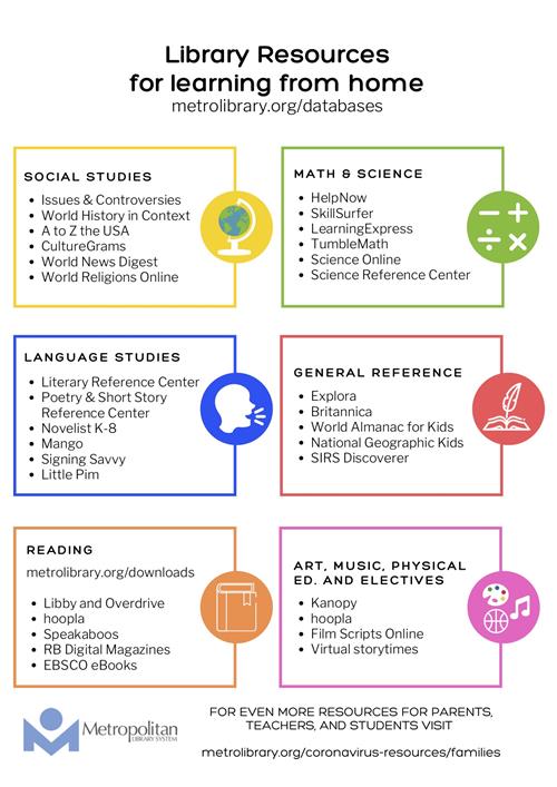Check out these free databases from the Metro Library for learning at home. Students can log in with their OneCard using their OKCPS Student Id Number and Last Name as the password.